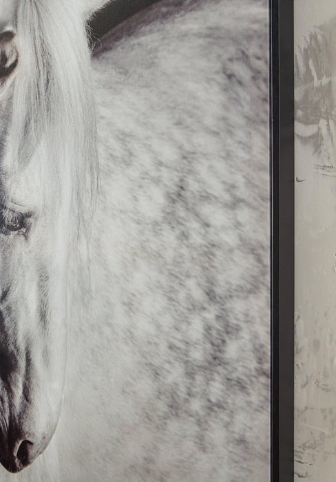 This wall art is a handsomely detailed addition to your wall decor. The black and white color grading adds an air of elegance to the portrait. Chic in casual and contemporary spaces alike, it’s a graceful interpretation of equine beauty.